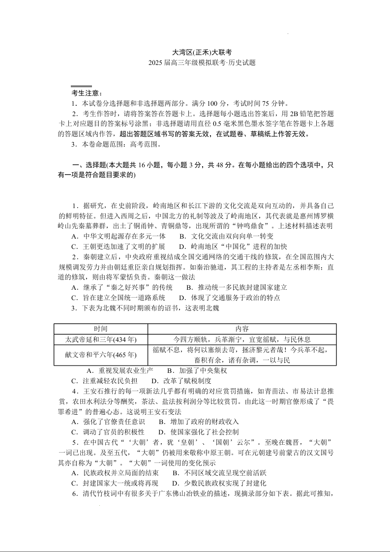 2025届广东省大湾区(正禾)大联考高三上学期模拟联考 历史