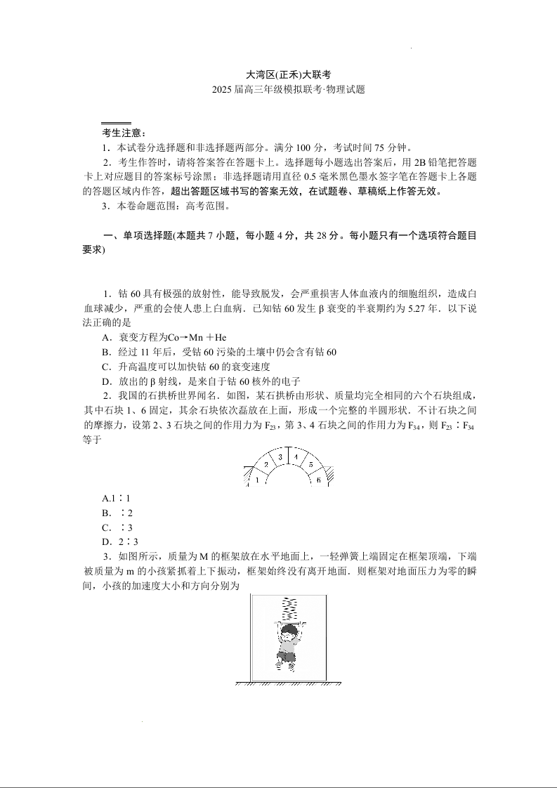 2025届广东省大湾区(正禾)大联考高三上学期模拟联考 物理