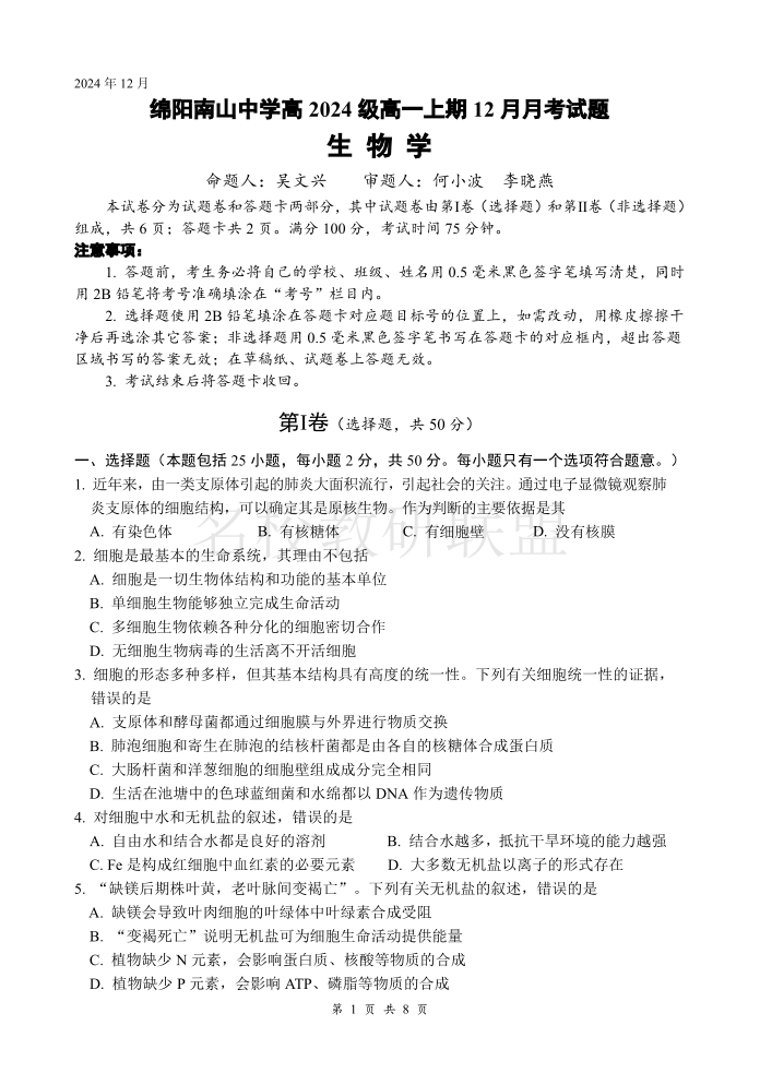 四川省绵阳市南山中学2024-2025学年高一上学期12月月考 生物