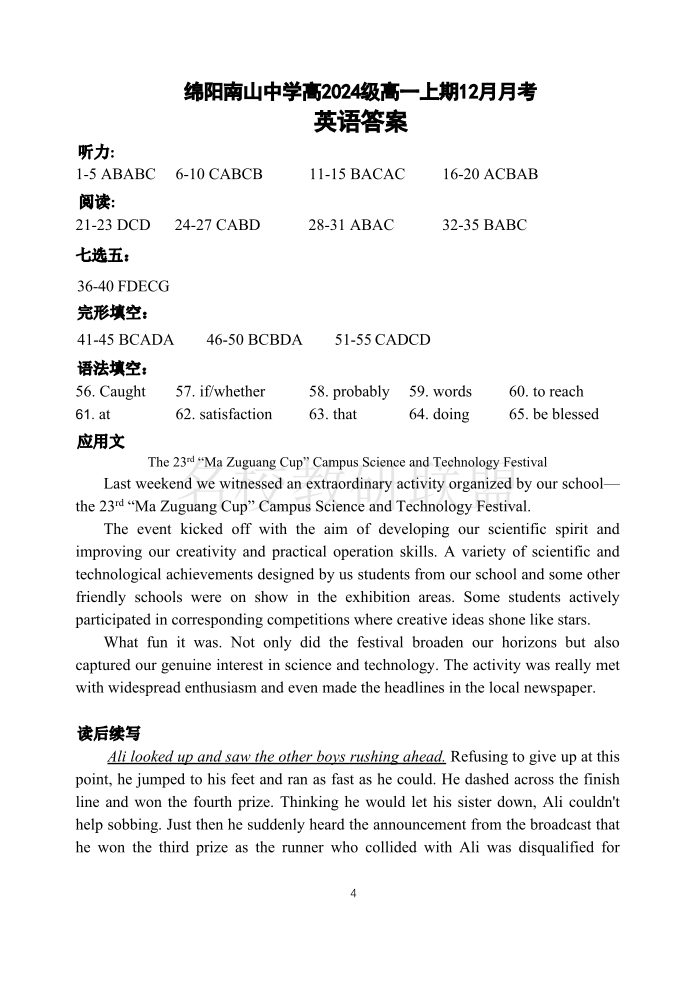 四川省绵阳市南山中学2024-2025学年高一上学期12月月考 英语答案