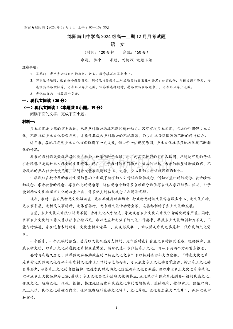 四川省绵阳市南山中学2024-2025学年高一上学期12月月考 语文