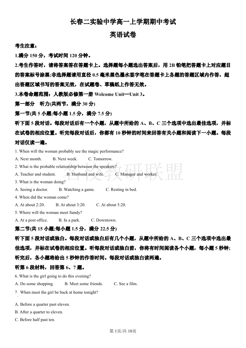吉林省长春第二实验中学2024-2025学年高一上学期期中考试 英语