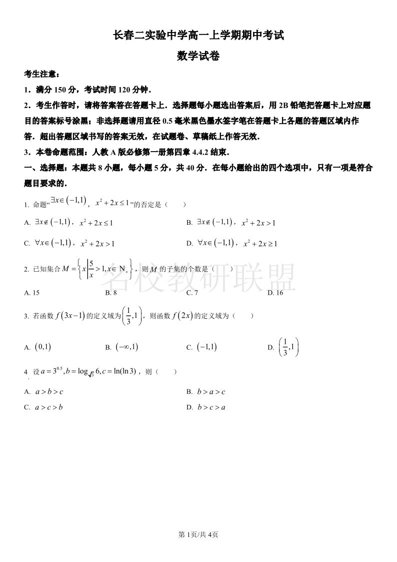 吉林省长春第二实验中学2024-2025学年高一上学期期中考试 数学