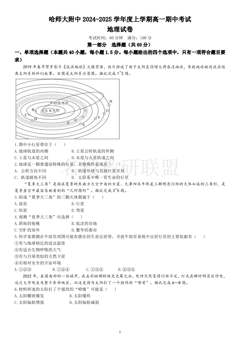 黑龙江省哈尔滨师范大学附属中学2024-2025学年高一上学期期中考试 地理