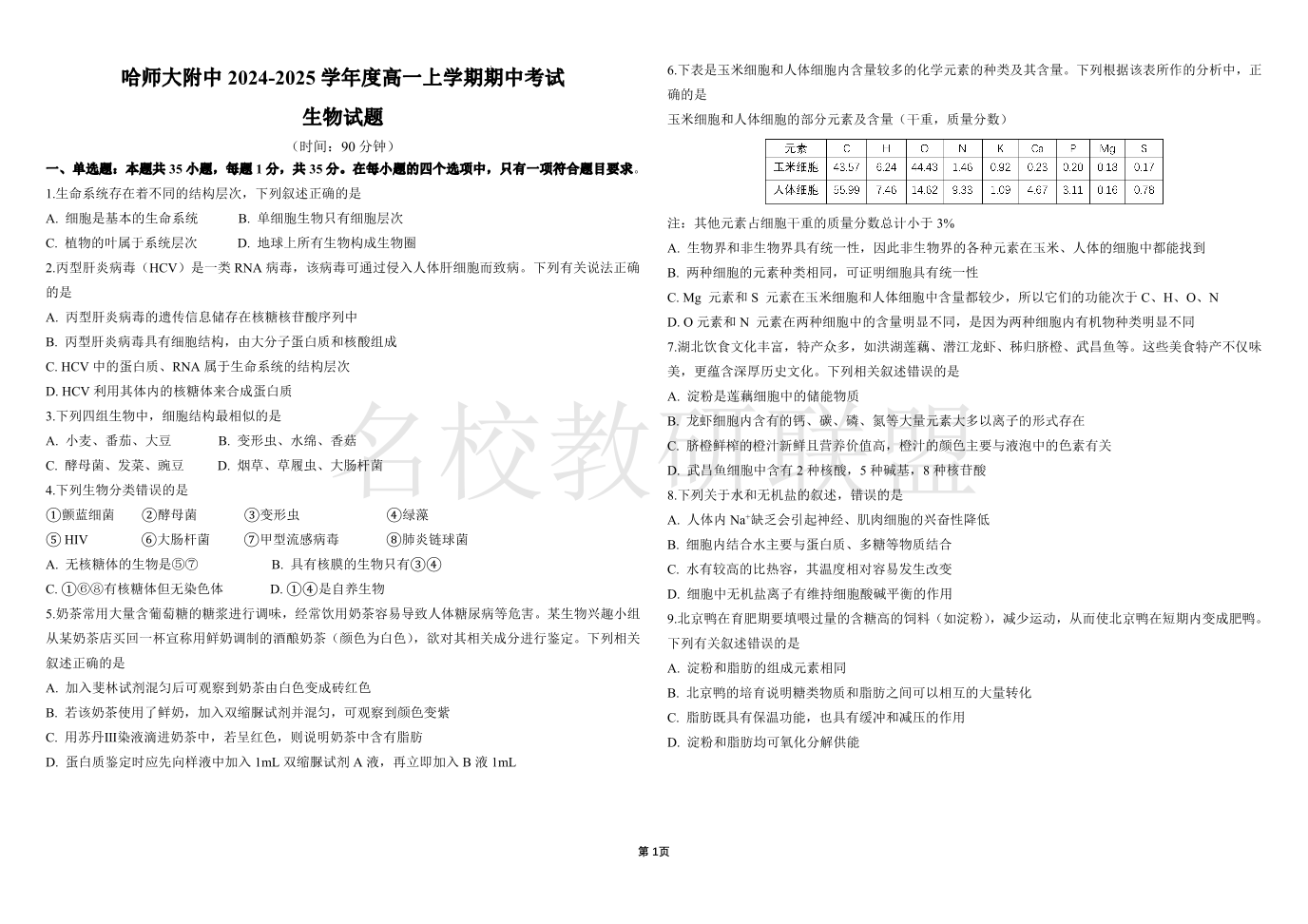 黑龙江省哈尔滨师范大学附属中学2024-2025学年高一上学期期中考试 生物