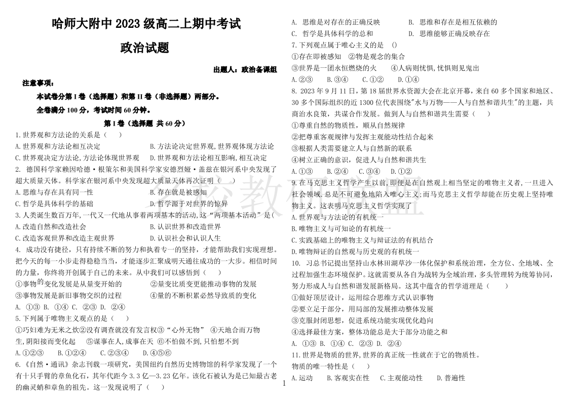 黑龙江省哈尔滨师范大学附属中学2024-2025学年高二上学期期中考试 政治