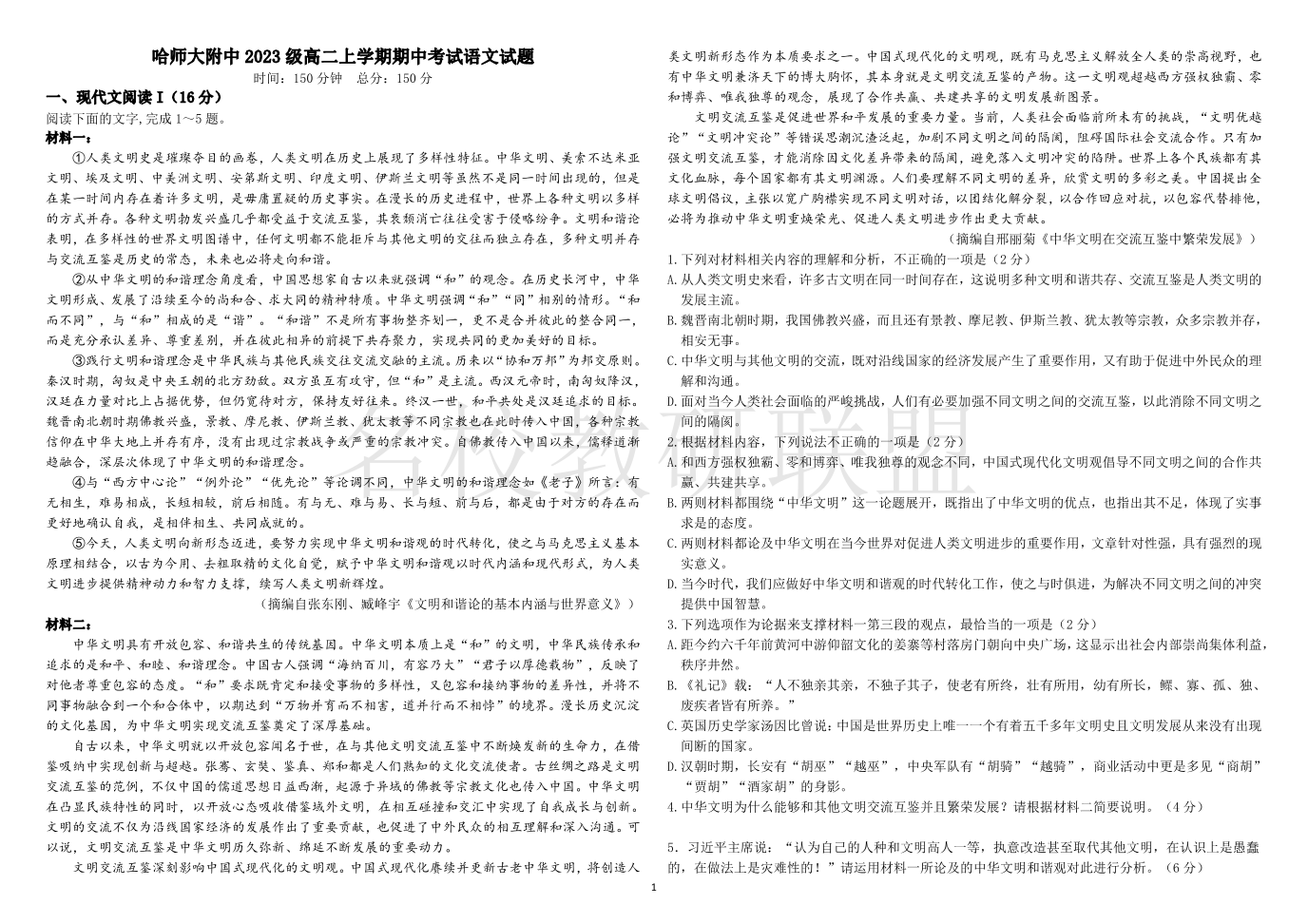 黑龙江省哈尔滨师范大学附属中学2024-2025学年高二上学期期中考试 语文