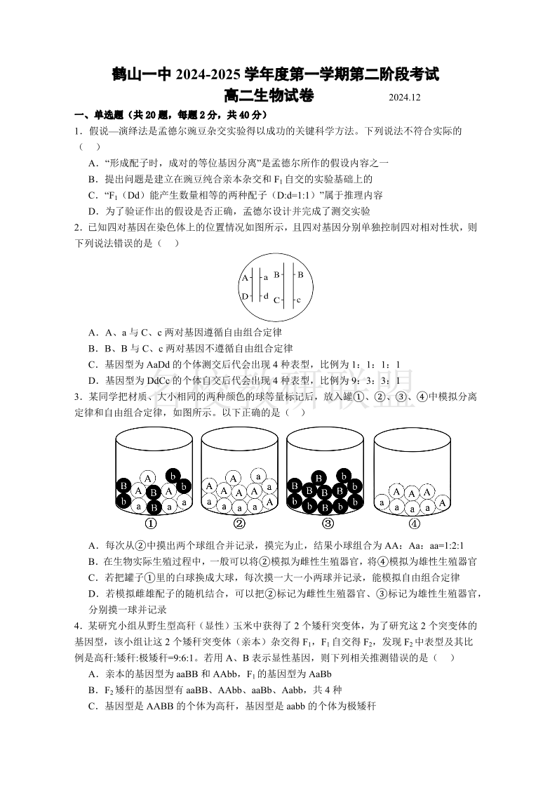 鹤山一中2024-2025学年度第一学期第二阶段考试 生物