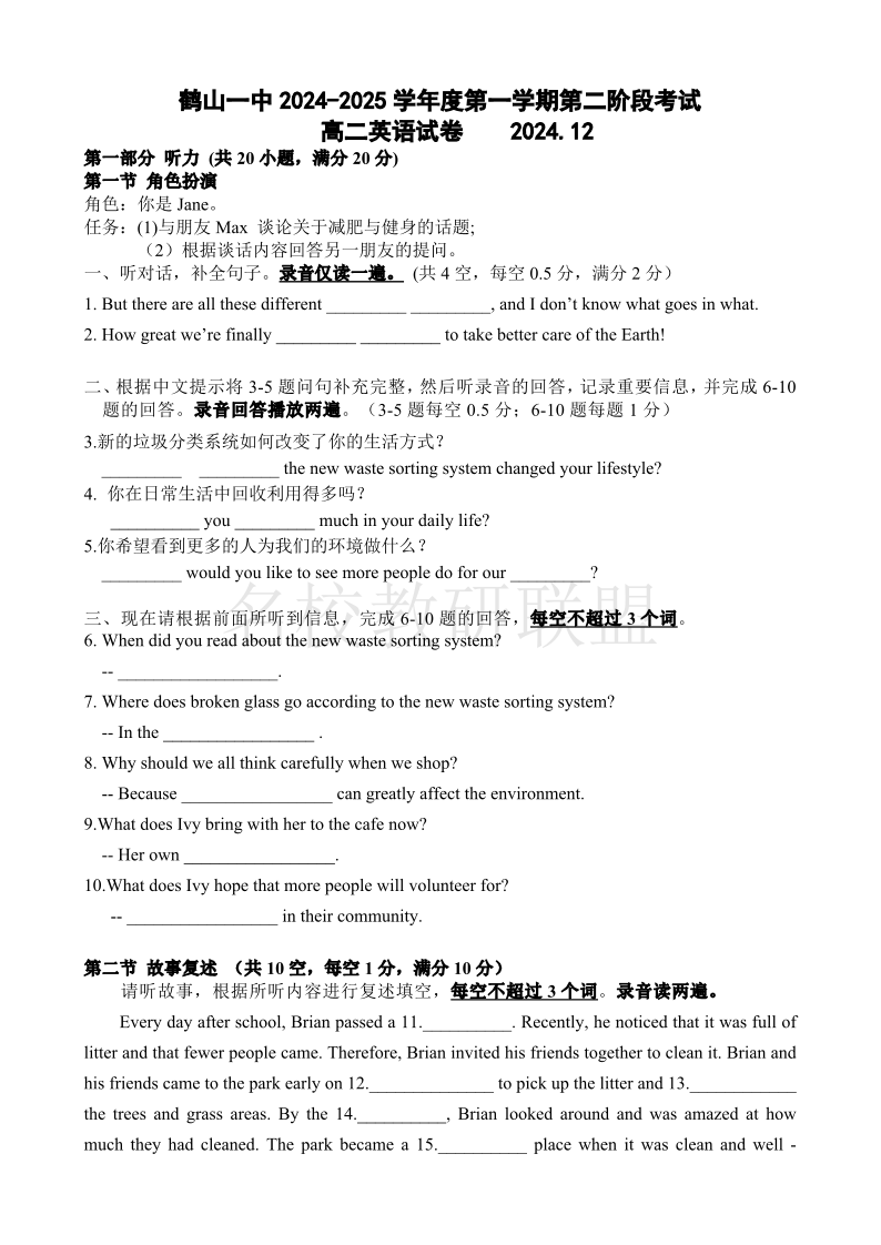 鹤山一中2024-2025学年度第一学期第二阶段考试 英语