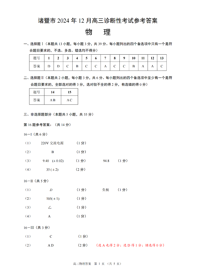 诸暨市2024年12月高三诊断性测试 物理答案