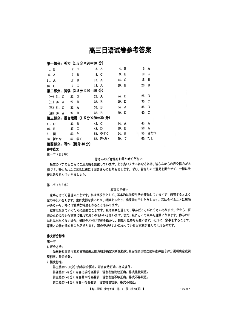 诸暨市2024年12月高三诊断性测试 日语答案