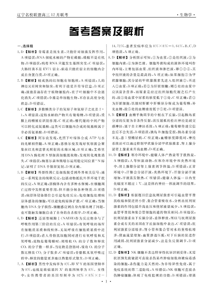 辽宁省名校联盟2024年高三12月份联合考试 生物答案