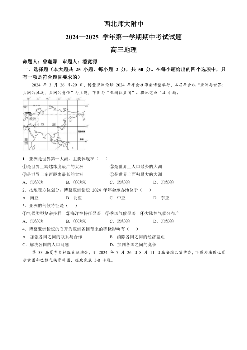 甘肃省西北师范大学附属中学2024-2025学年高三上学期期中考试 地理