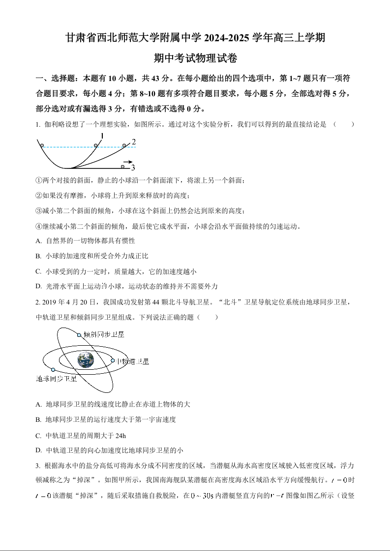 甘肃省西北师范大学附属中学2024-2025学年高三上学期期中考试 物理