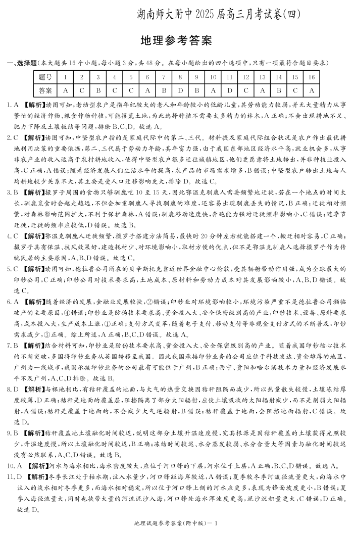 湖南师范大学附属中学2025届高三上学期月考卷(四)地理答案