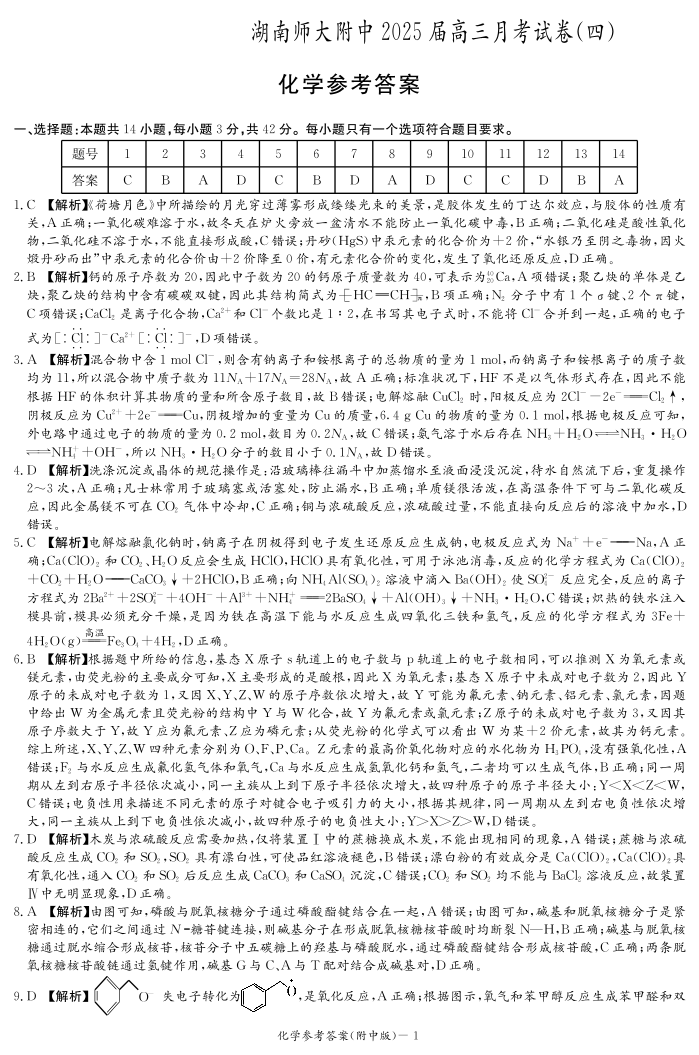湖南师范大学附属中学2025届高三上学期月考卷(四)化学答案