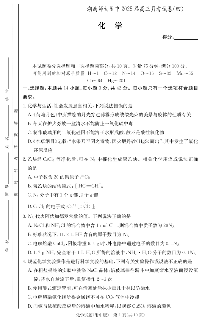 湖南师范大学附属中学2025届高三上学期月考卷(四)化学
