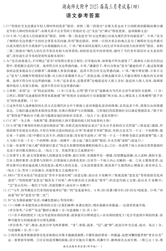 湖南师范大学附属中学2025届高三上学期月考卷(四)语文答案