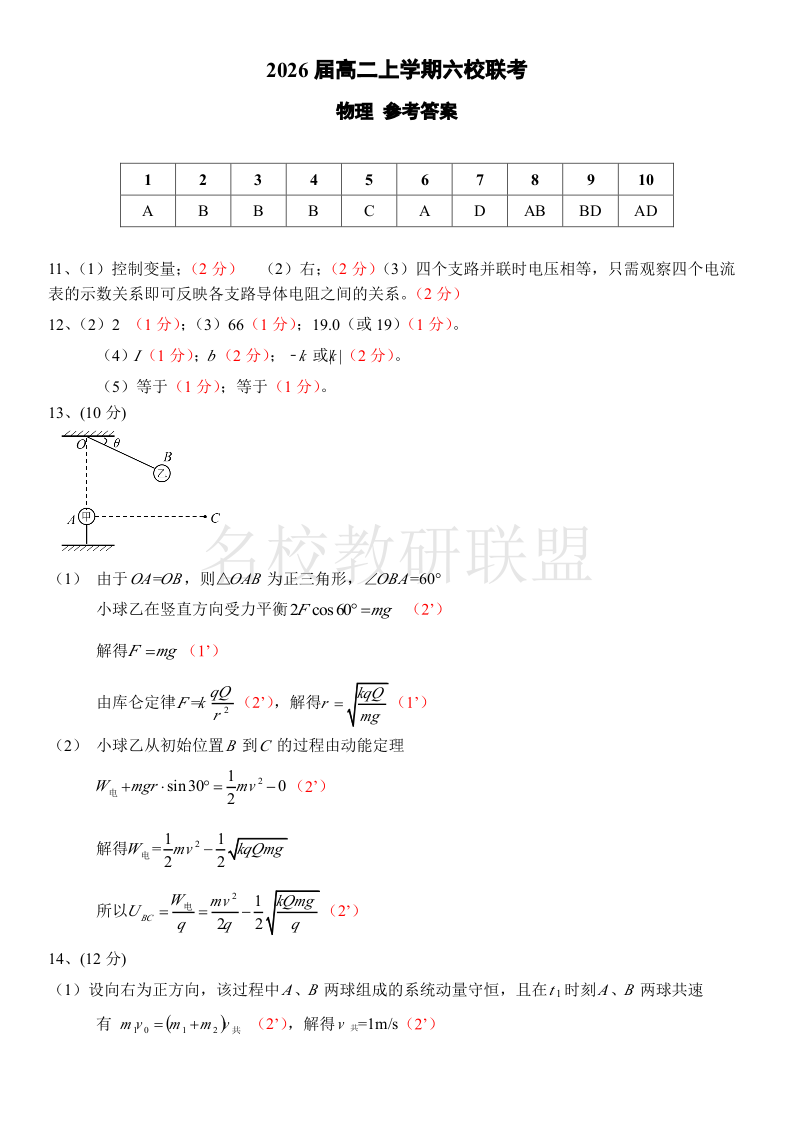 广东省六校联考2024-2025学年高二上学期12月月考 物理答案