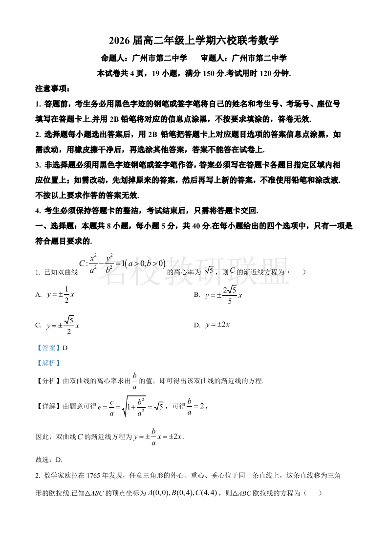 广东省六校联考2024-2025学年高二上学期12月月考 数学答案