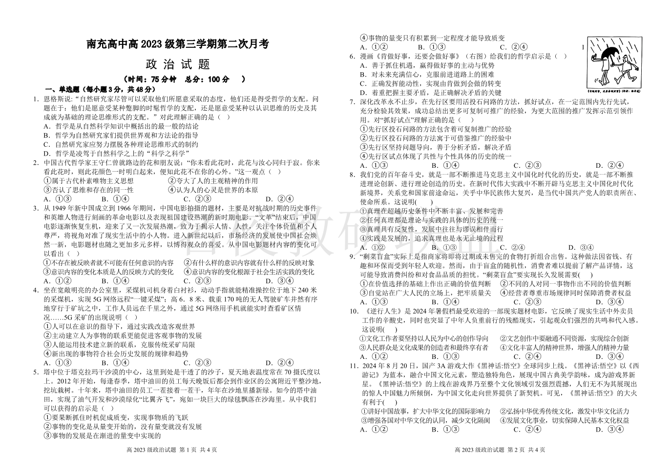 四川省南充高级中学2024-2025学年高二上学期第二次月考 政治