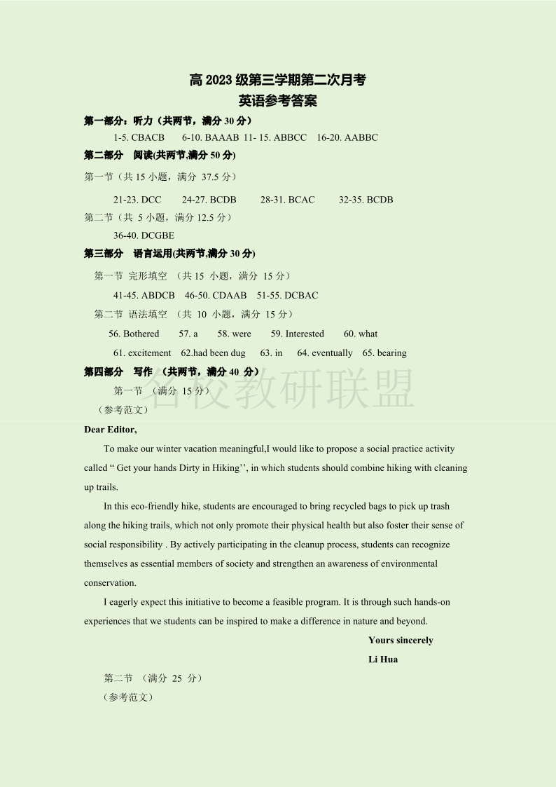 四川省南充高级中学2024-2025学年高二上学期第二次月考 英语答案