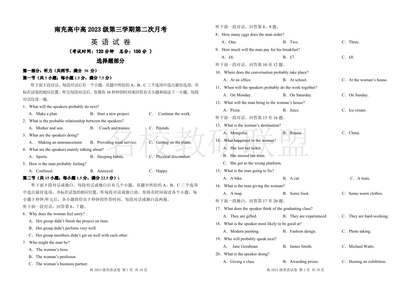 四川省南充高级中学2024-2025学年高二上学期第二次月考 英语