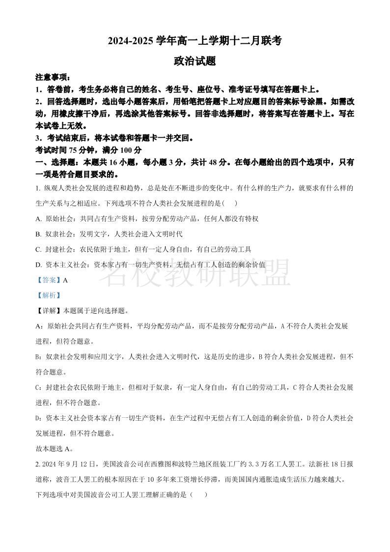 辽宁省朝阳市重点高中2024-2025学年高一上学期12月联考 政治答案