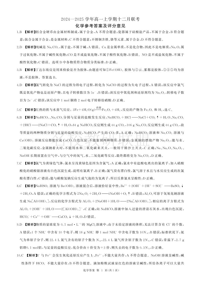 辽宁省朝阳市重点高中2024-2025学年高一上学期12月联考 化学答案