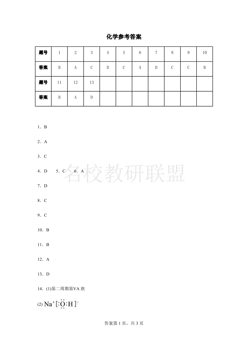 2024灌南高中协作体高一月考联考 化学答案