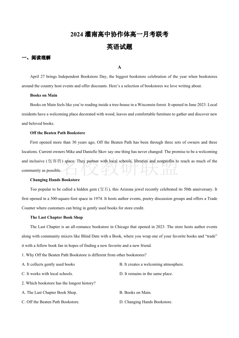 2024灌南高中协作体高一月考联考 英语