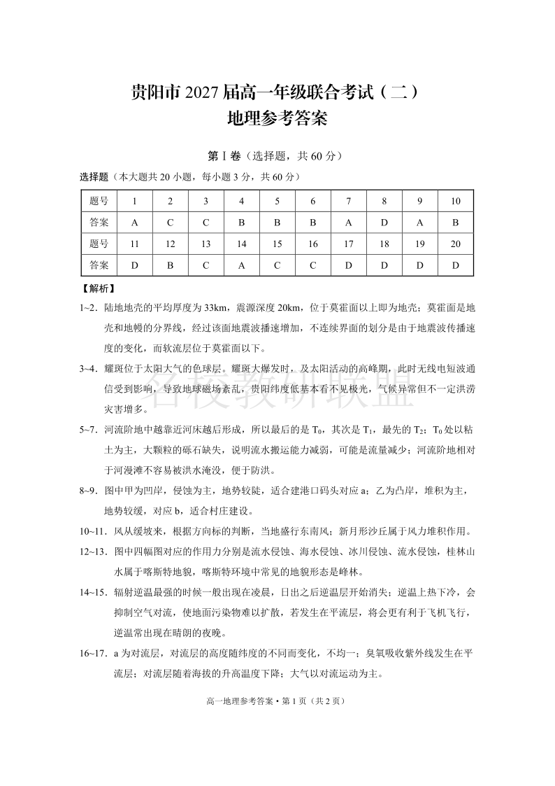 贵州省贵阳市2024-2025学年高一上学期12月月考 地理答案