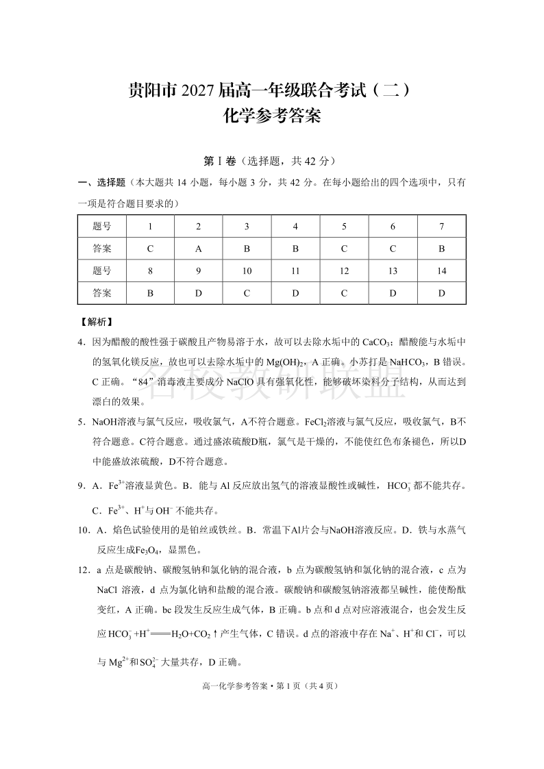 贵州省贵阳市2024-2025学年高一上学期12月月考 化学答案
