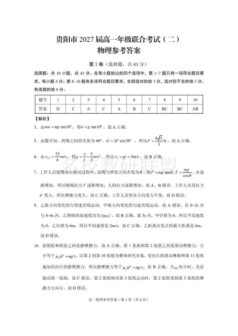 贵州省贵阳市2024-2025学年高一上学期12月月考 物理答案