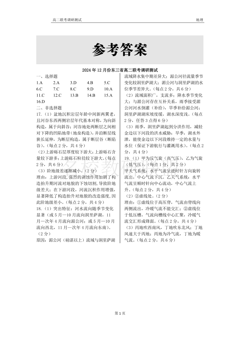 东三省2024-2025学年高二上学期12月联考调研测试 地理答案