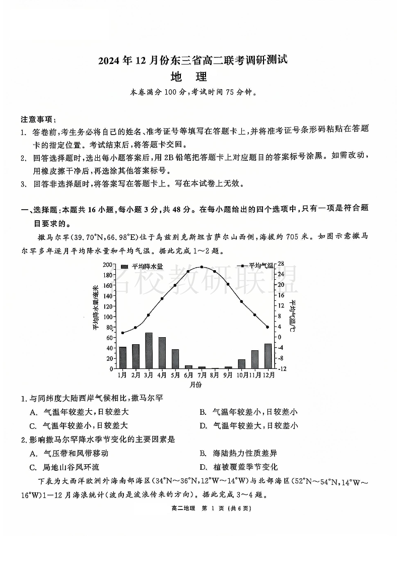 东三省2024-2025学年高二上学期12月联考调研测试 地理