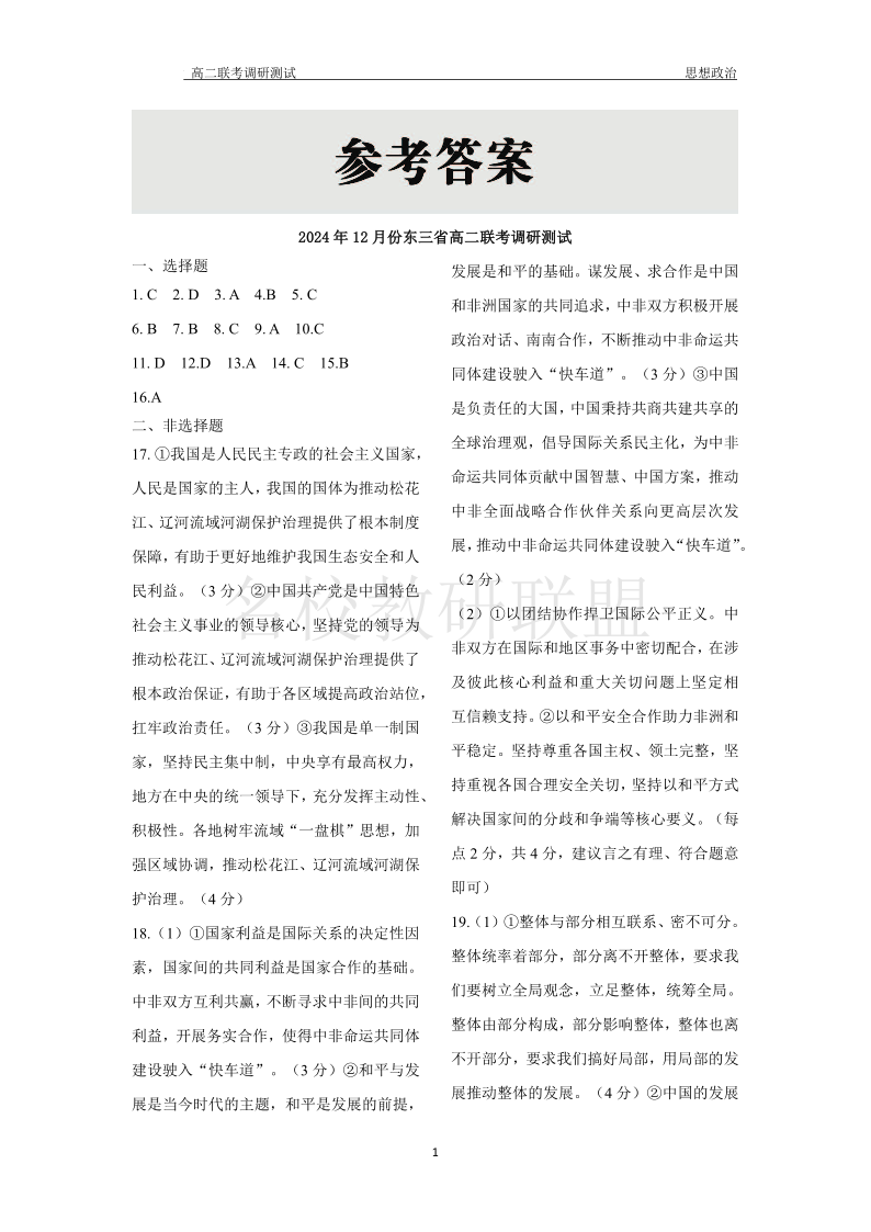 东三省2024-2025学年高二上学期12月联考调研测试 政治答案