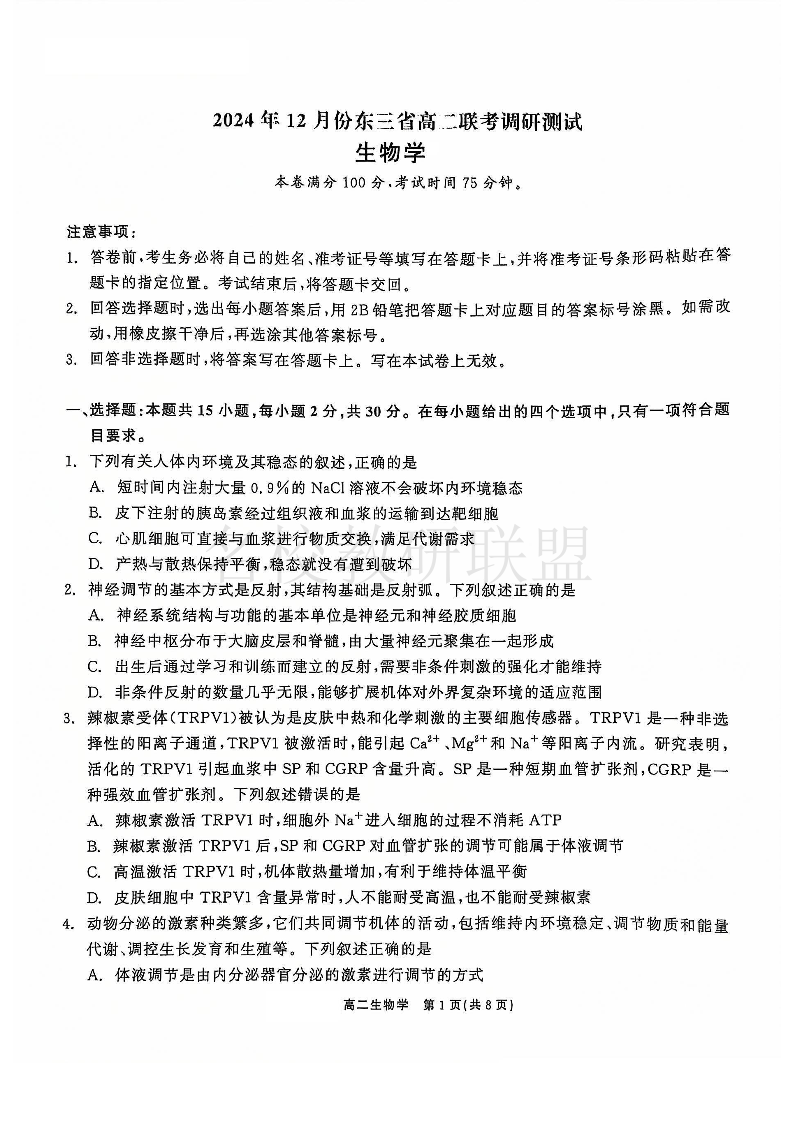 东三省2024-2025学年高二上学期12月联考调研测试 生物