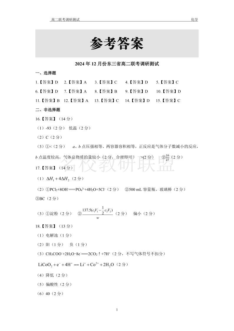 东三省2024-2025学年高二上学期12月联考调研测试 化学答案