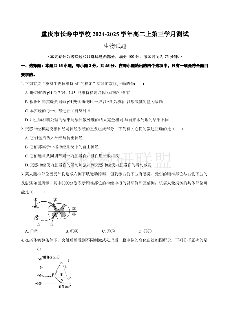 重庆市长寿中学2024-2025学年高二上学期12月月考 生物
