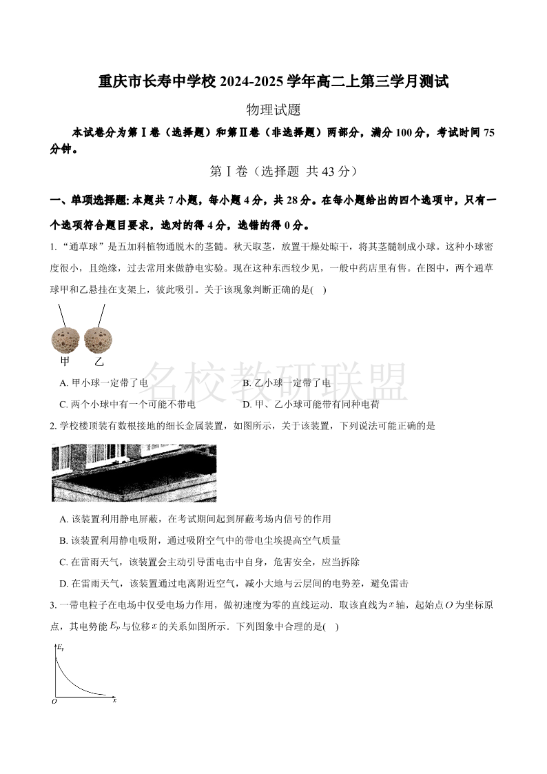 重庆市长寿中学2024-2025学年高二上学期12月月考 物理