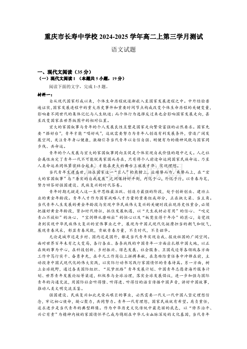 重庆市长寿中学2024-2025学年高二上学期12月月考 语文
