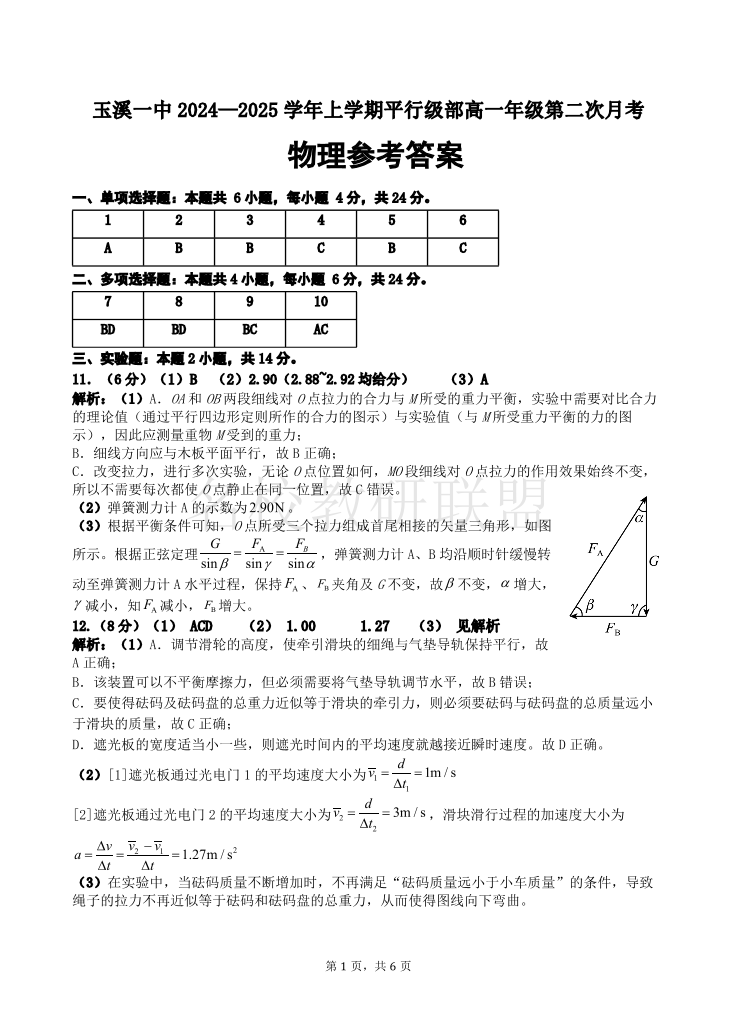 云南省玉溪市一中2024-2025学年高一上学期第二次月考 物理答案