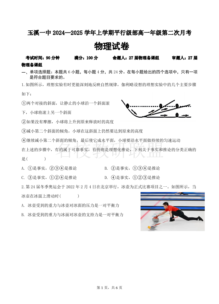 云南省玉溪市一中2024-2025学年高一上学期第二次月考 物理