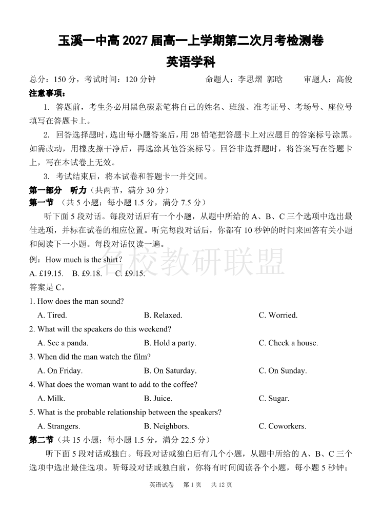 云南省玉溪市一中2024-2025学年高一上学期第二次月考 英语