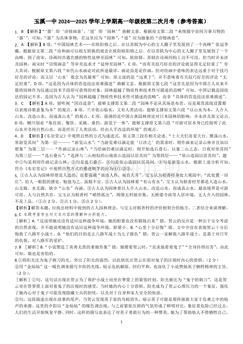 云南省玉溪市一中2024-2025学年高一上学期第二次月考 语文答案