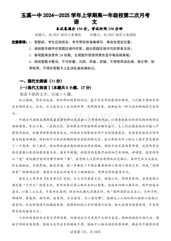 云南省玉溪市一中2024-2025学年高一上学期第二次月考 语文