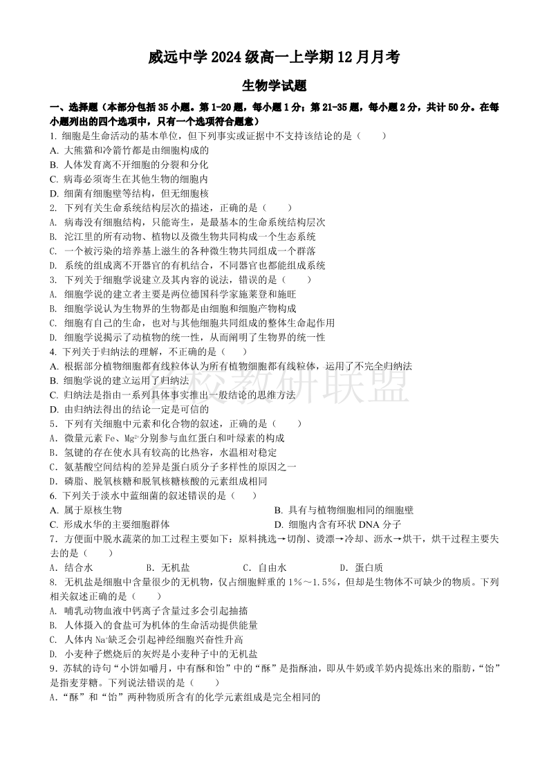 四川省内江市威远中学2024-2025学年高一上学期12月月考 生物