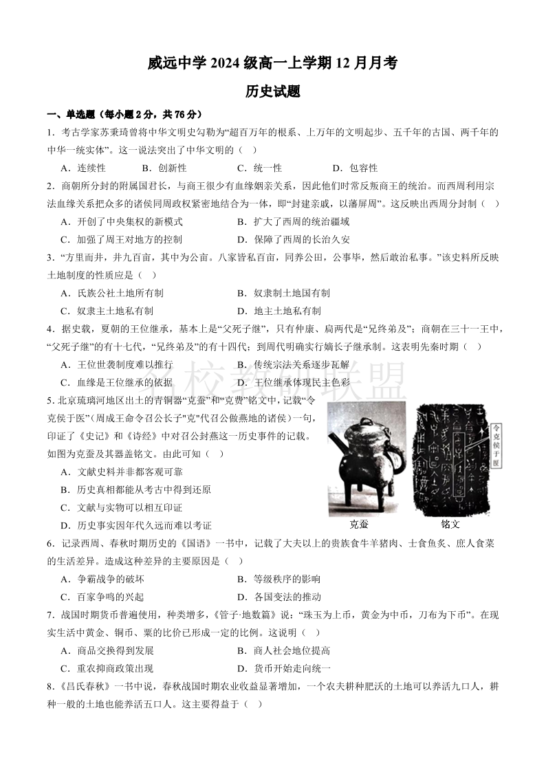 四川省内江市威远中学2024-2025学年高一上学期12月月考 历史