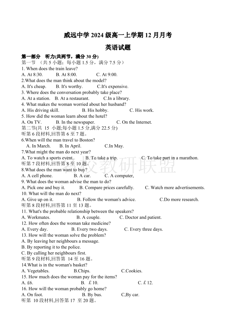 四川省内江市威远中学2024-2025学年高一上学期12月月考 英语